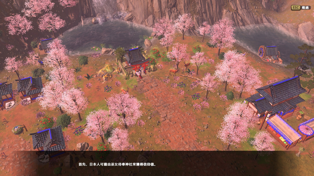 日本信仰值獲取方式為女巫在神社面前祈福跳舞,而神社如蓋在附近有野生動物、樹木或是金礦之處能有額外加乘,跟世紀帝國4 的羅斯狩獵小屋有些類似。