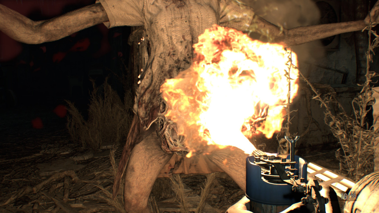 在陰森不詳的廢棄宅邸,人是見到了,但卻中邪似地要砍死主角。也見到貝克一家三口瘋子和多頭齜牙咧嘴、超機八噁的"菌屍"。玩家跟著伊森,用第一人稱的視角,經歷一切、理解一切、超渡一切XD。