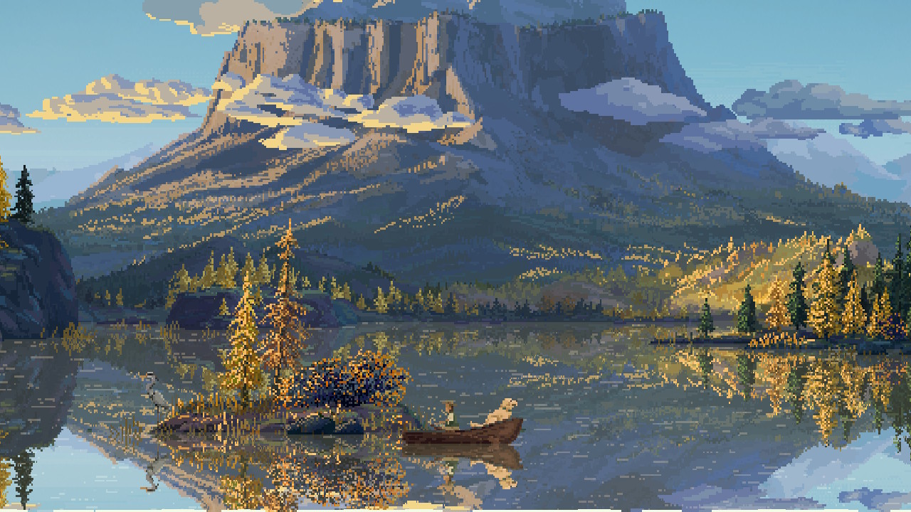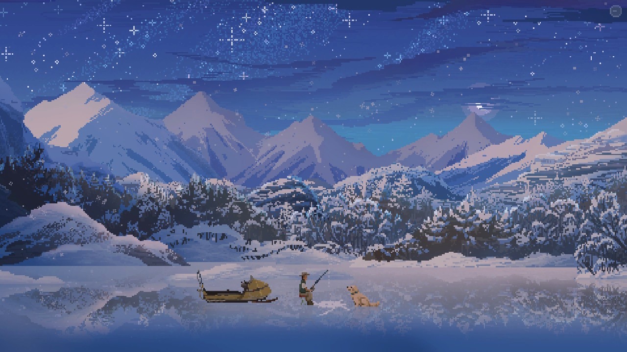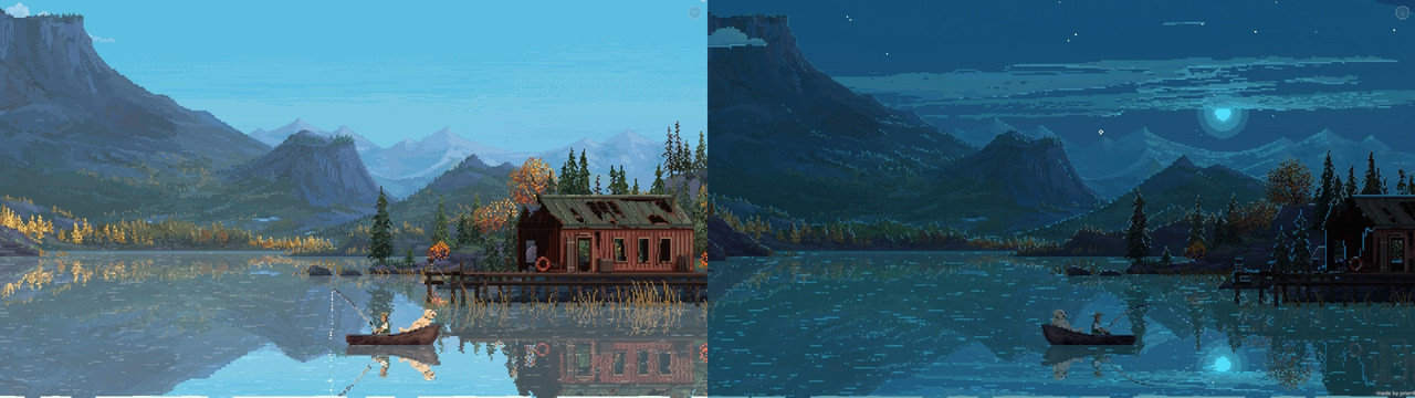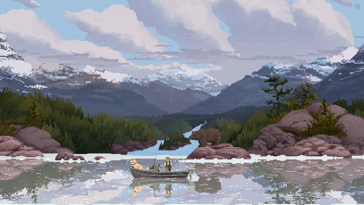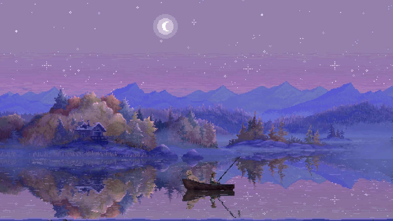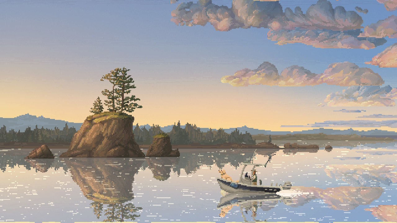 選定角色造型、狗狗種類,划船出發去釣魚;這是個主打美術畫風的釣魚小品,遊戲性低,亮點在於美不勝收的像素場景,買藝術品送遊戲的概念。