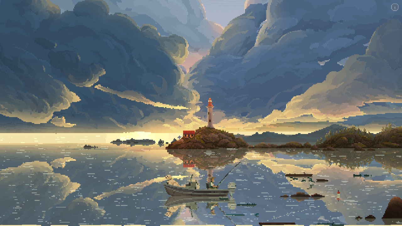 遊戲的點陣圖並不細緻,但透過多層背景、水面倒影、細節處的明暗變化,呈現出一種如詩如畫的藝術感。航向釣點之前,會有一段淡淡的配樂,配上秀麗的景觀,帶出的放鬆悠閒感,非常棒。