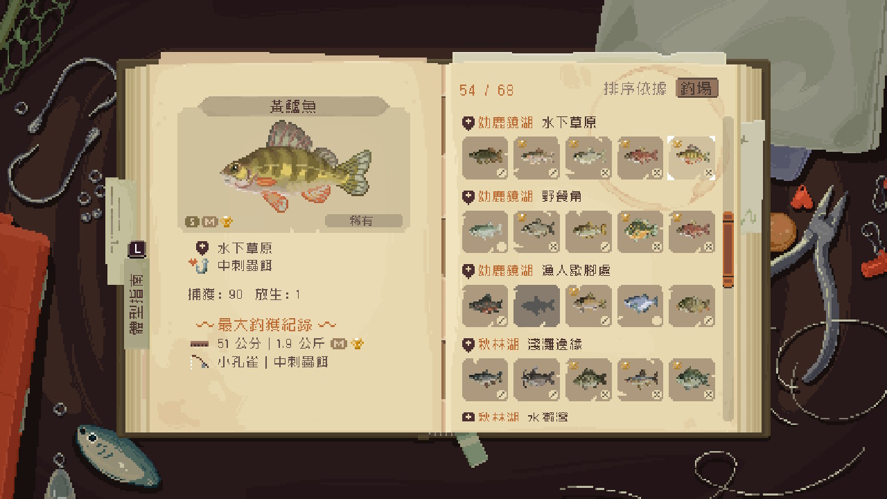 漁獲賣錢,再用錢升級釣竿、購買魚餌、解鎖其它區域。魚會不會上鉤、能不能釣起,很大程度來自於竿和餌的種類。每個釣點都有五種魚,釣到並填補圖鑑,是本作的基本遊玩循環。