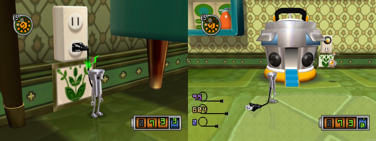 在電量歸零之前,走到插座位置,再用他申後長長的電線插頭充電(走路的時候,舉著插頭會比拖著走快)。如果沒電了,會被強制送回基地,探索到一半被中斷蠻浪費時間 算是小懲罰;而基地造型是電鍋,也是夠鬧。