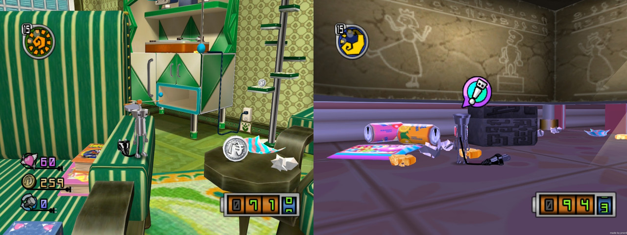 另一個特色則是充電機制。機器人平常就會緩慢耗電,一些動作會耗得更多,如使用螺旋槳、電池砲擊、攀爬、使用雲梯裝置等等。遊戲過程拿到的快樂點數,累積一定數目後機器人排名上升,就能增加電池容量。