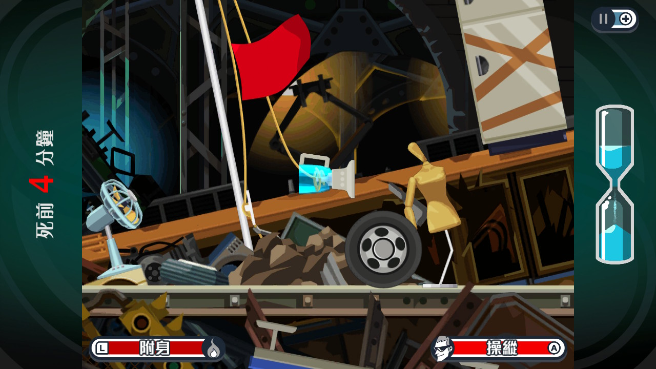 靈魂沒有腳,是以連連看的方式在物品之間穿梭移動,如果無法到達關鍵位置,就得想辦法製造機會,如依附在會動的物體,或是把某個東西弄過去形成橋樑。下面這張圖,先開冰箱讓果汁機滑落,接著啟動電風扇,吹起旗幟,並讓繩子纏住果汁機;接著讓旋轉的果汁機葉片,帶動升旗,藉此移動到上層區域。