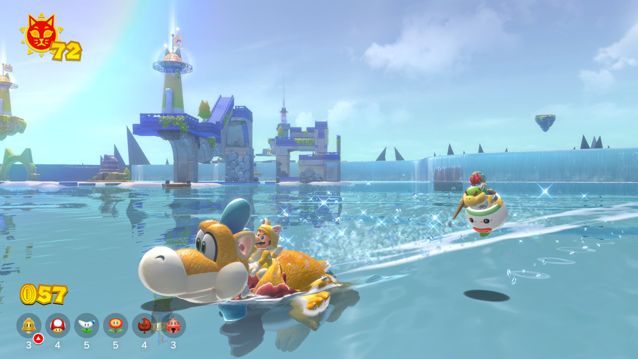 瑪利歐掉到一個被污染的大湖泊,碰到了小庫巴,請求瑪叔叔拯救抓狂的爸爸庫巴;闖關的目標是收集貓咪太陽之力,恢復燈塔的光芒,淨化被污泥籠罩的水域,並擊敗黑化狂怒的庫巴。