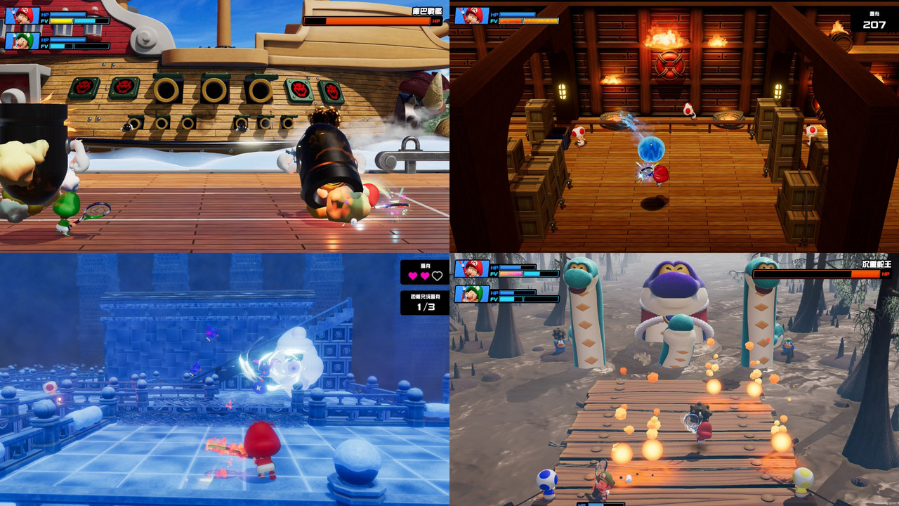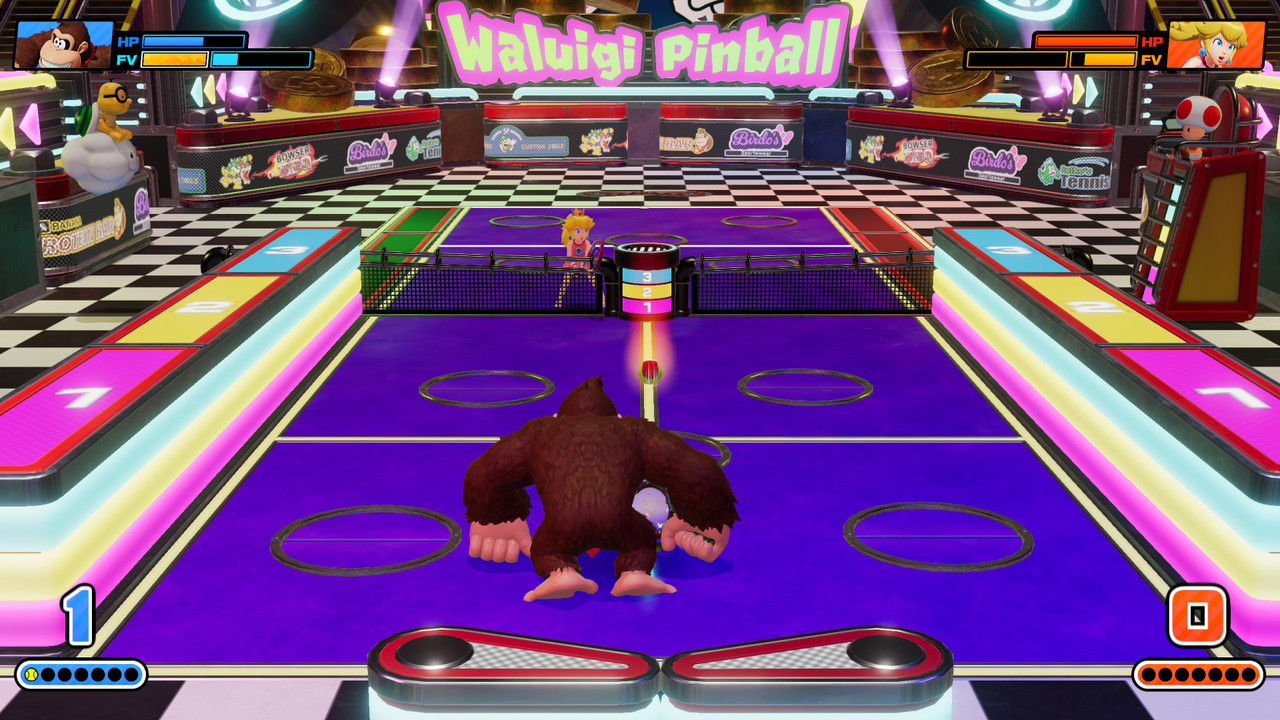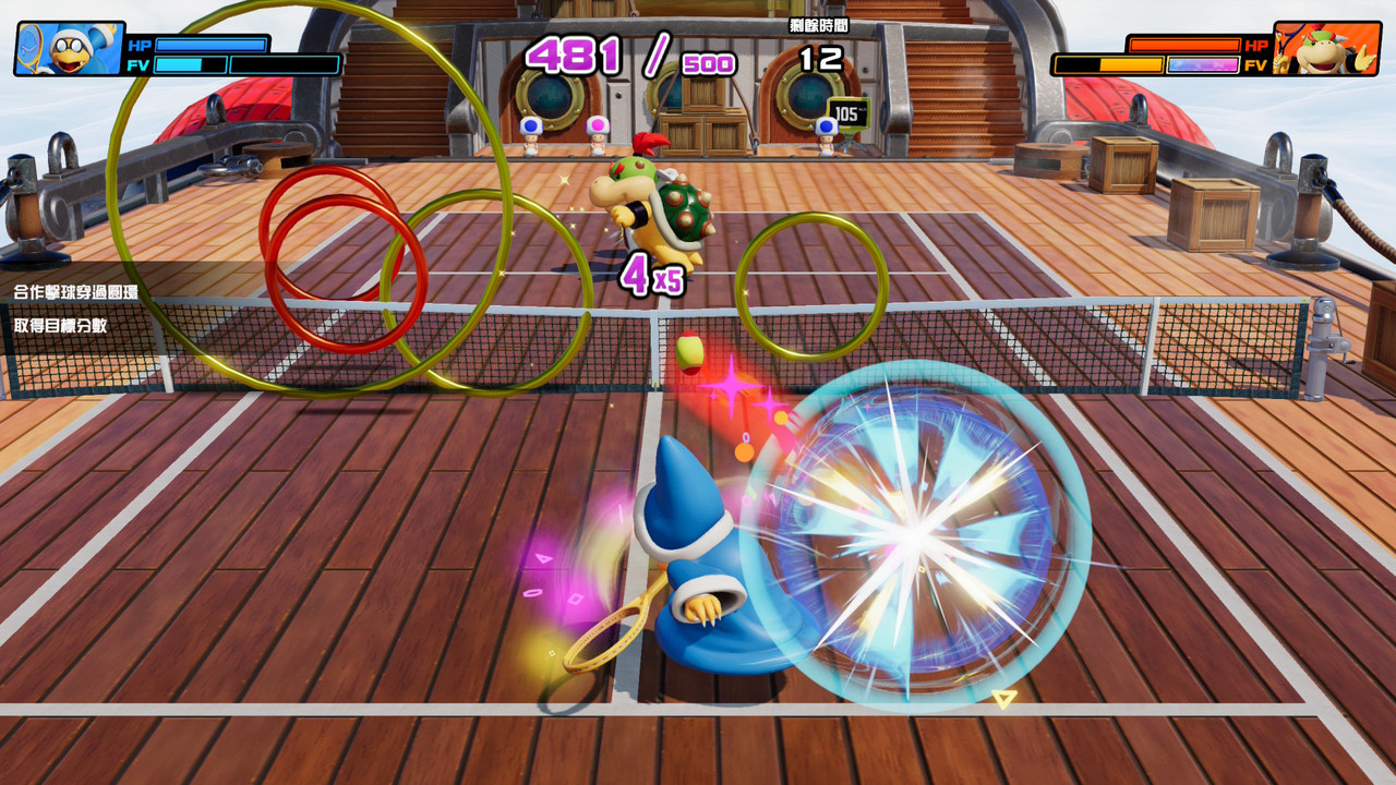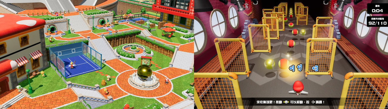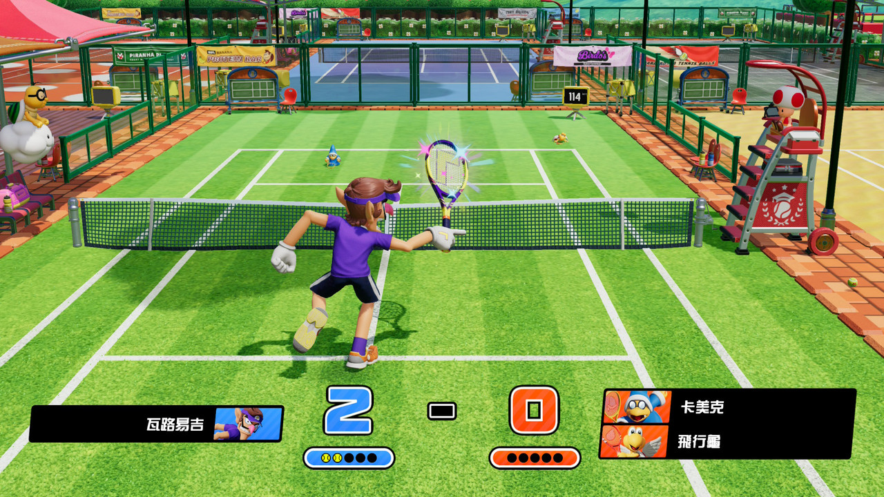 闖關稍微有趣些,以網球對打延伸出蠻有意思的形式,例如回擊砲彈、水球滅火,還有對付來自其他瑪利歐作品的角色:奧德賽龍捲風、3D世界的蛇王、2D瑪的蜘蛛。