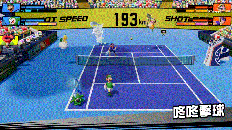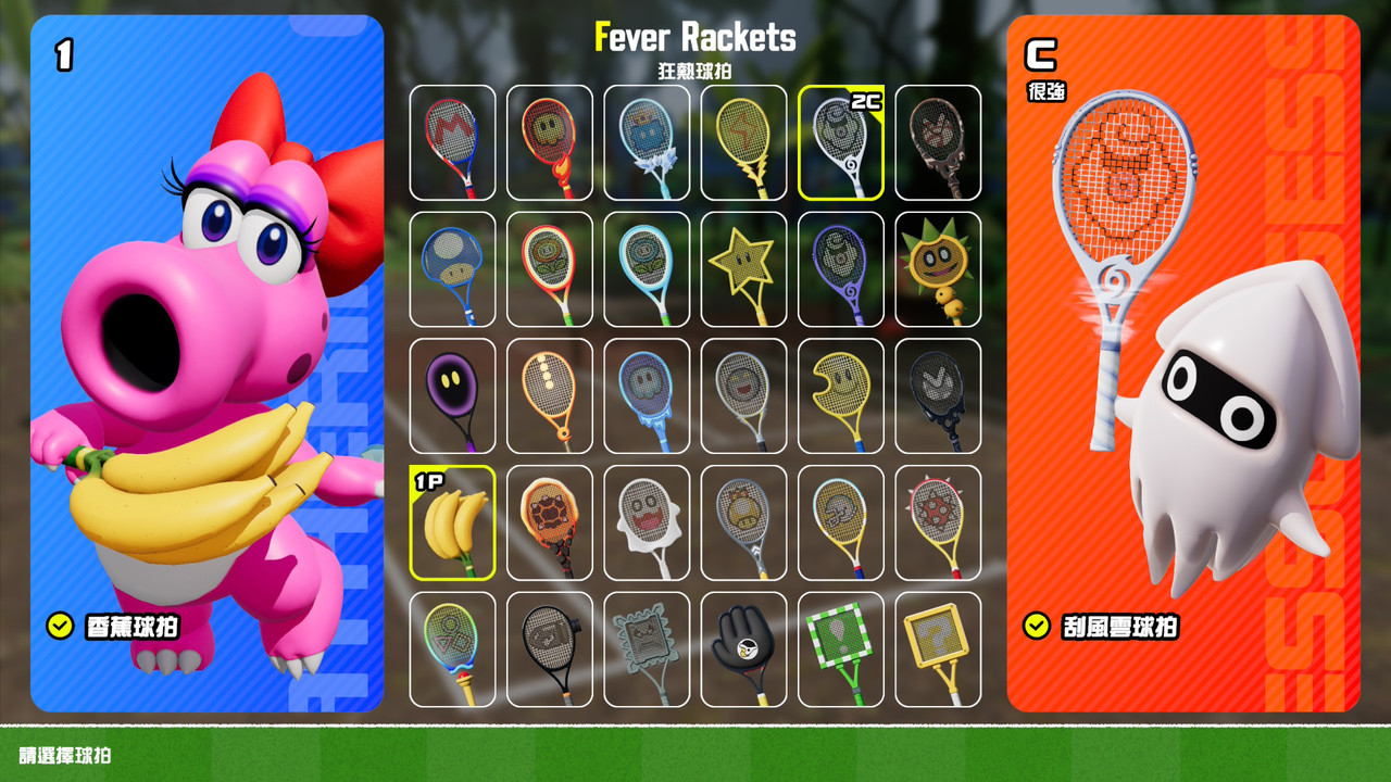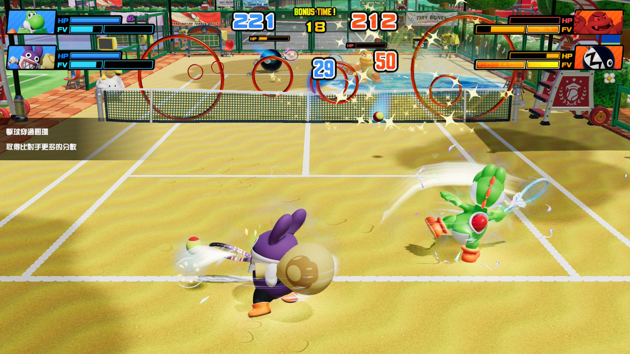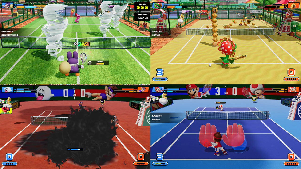 本作網球 Fever,除了角色們的操作性能與擊球特色外,多種效果的「狂熱球拍」,以放絕招的形式,在場地上增加干擾效果,如吹歪角色和球路的龍捲風、散落一地的刺丸丸、遮擋視線的汙泥、把對手往場後推的擊球等等等,共有 30 種不同效果的球拍,賦予靜態球場更多不可控的變化性,趣味程度是近年瑪利歐運動遊戲之最。