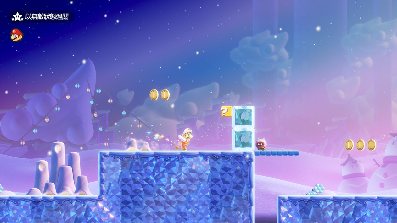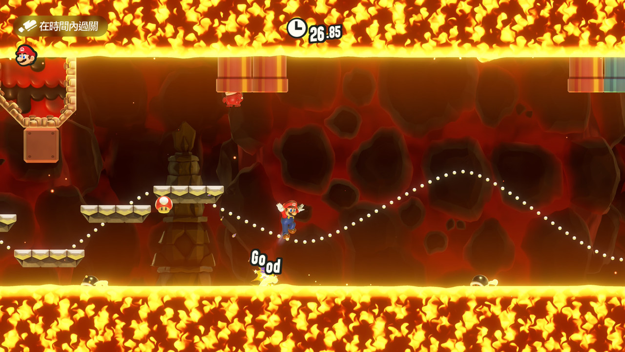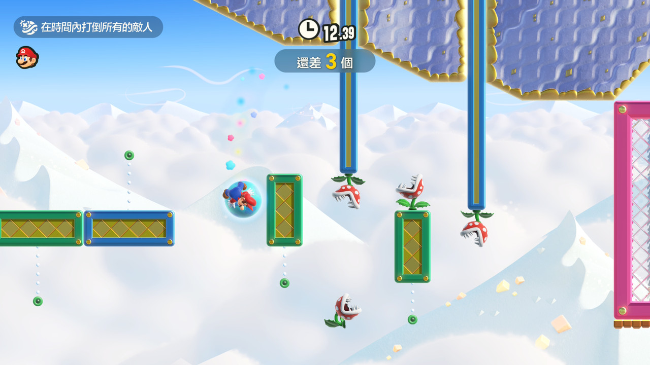 挑戰項目可大略分為兩類,限時和無傷。限時講求的就是闖盪速度,吃完金幣、打完敵人、維持無敵星狀態,有一點咚奇剛的跑酷味道;無傷,精確說是不能觸碰敵人或是金幣,剛好反過來,需要的是準確操作,欲速則不達。七個頭目戰也會放進挑戰,需要以沒有變身、一碰就死的小瑪利歐狀態應戰。雷公雲好幾次差那麼一下就先被電死,玩得我心跳加速。