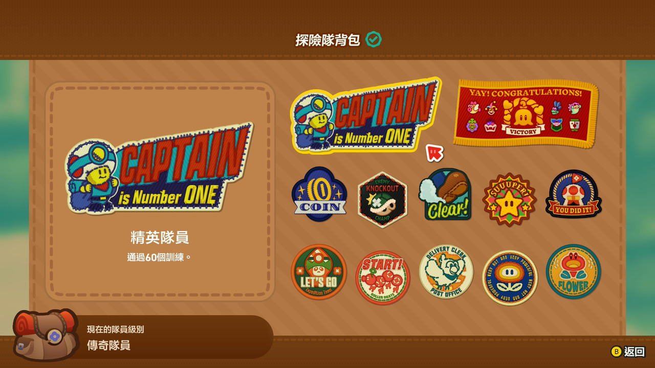 挑戰的成就以布章圖案呈現,Captain is Number One 顆顆。這奇諾比奧還是古早味造型。