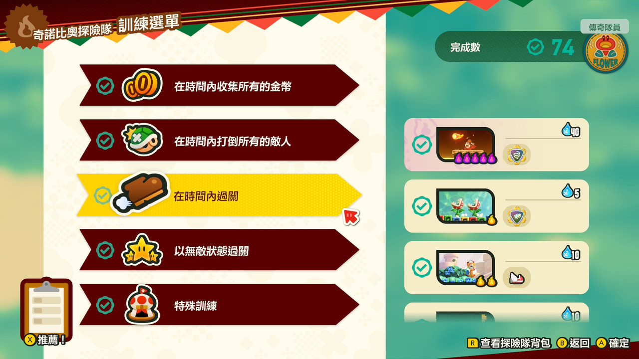 魔改本篇中的關卡配置,加入徽章限制與闖關規則,帶來截然不同的體驗。一共有 74 關,約有十來關讓我打很久,憑著玩大金剛遊戲計時全金牌+無傷模式 200% 的耐心與技術,一鼓作氣打通。