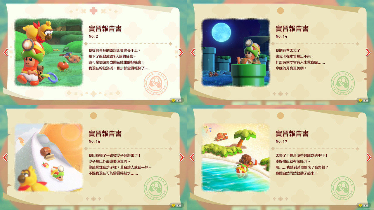 老任的作品除了好玩,在佈景細節、色彩運用和配樂襯托,也有著極高水準,這些元素雖非玩點,但討喜又讓人感受到遊戲世界中的魅力。看到隊長與苞普林的互動,真希望後續還能有奇諾比奧探險隊的小品遊戲啊~~~