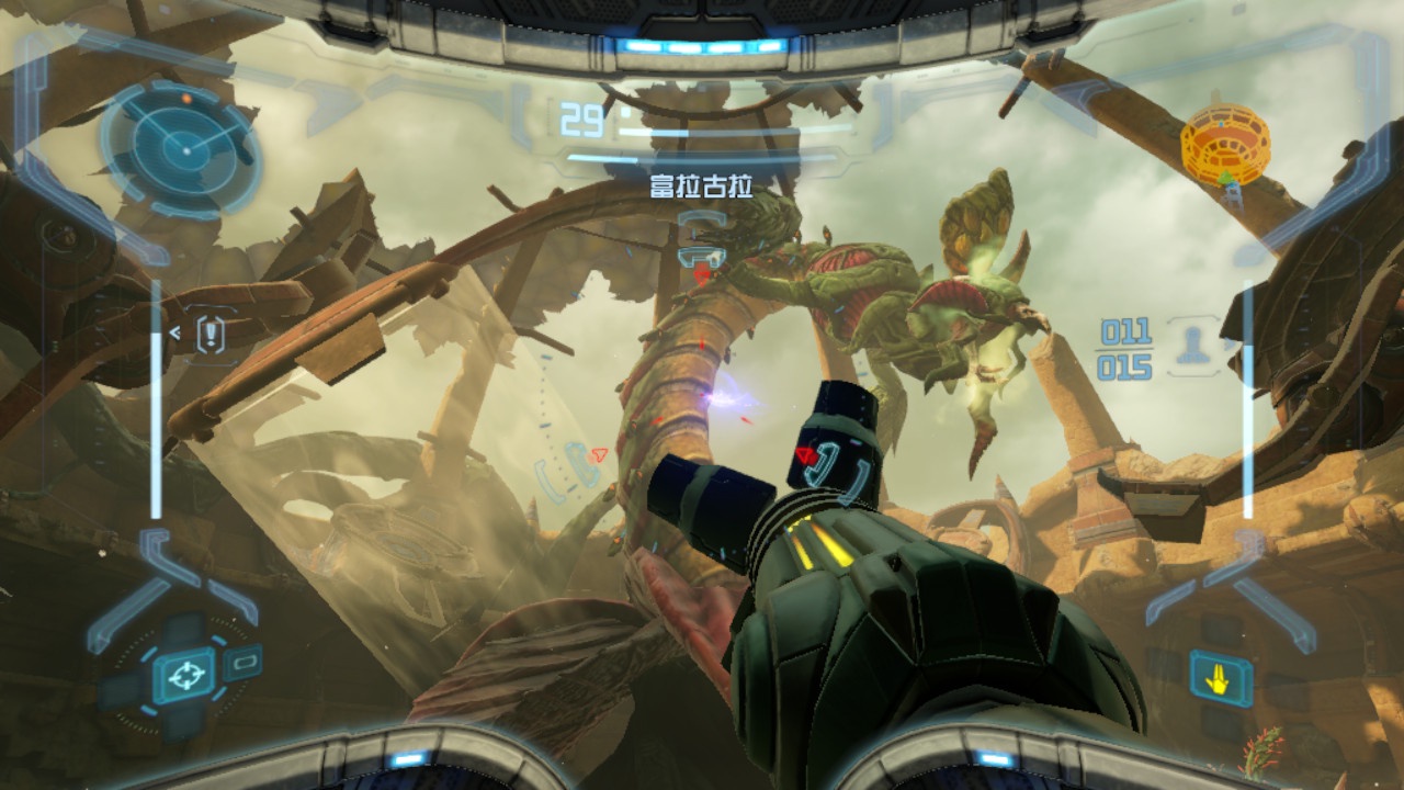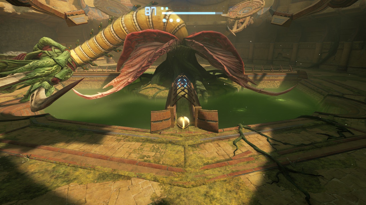 Boss 戰是機制型打法,到一定階段有不同應對方式。比如說把下面這個植栽怪物射趴之後,薩姆斯變球滾進去放炸彈。