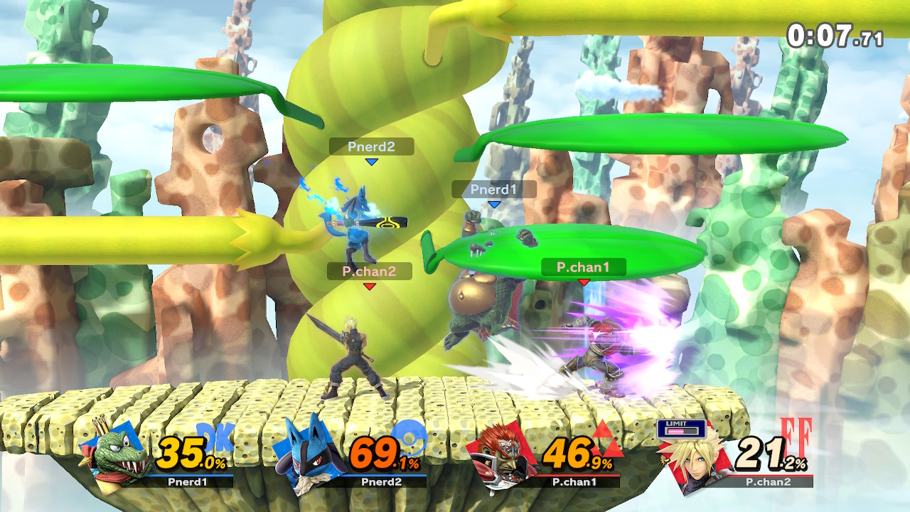 玩法是平面的混戰格鬥,要把所有人揍飛,受傷不是扣血條,而是增加擊飛機率,數字越高,越容易被打出界。招式的組成很精簡,就是方向鍵 + A或B + 有無蓄力,算是很好上手。