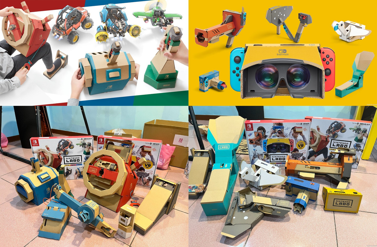 Labo 是個類似玩具的實驗性產品,先組裝紙板,再裝上手把玩對應的小遊戲,弄勞作的過程,有著類似組樂高的樂趣。利用實體紙板 + Joycon 模擬出真實動作的手感,例如拉竿釣魚、握著搖桿開飛機、上膛開槍的VR射擊等等。