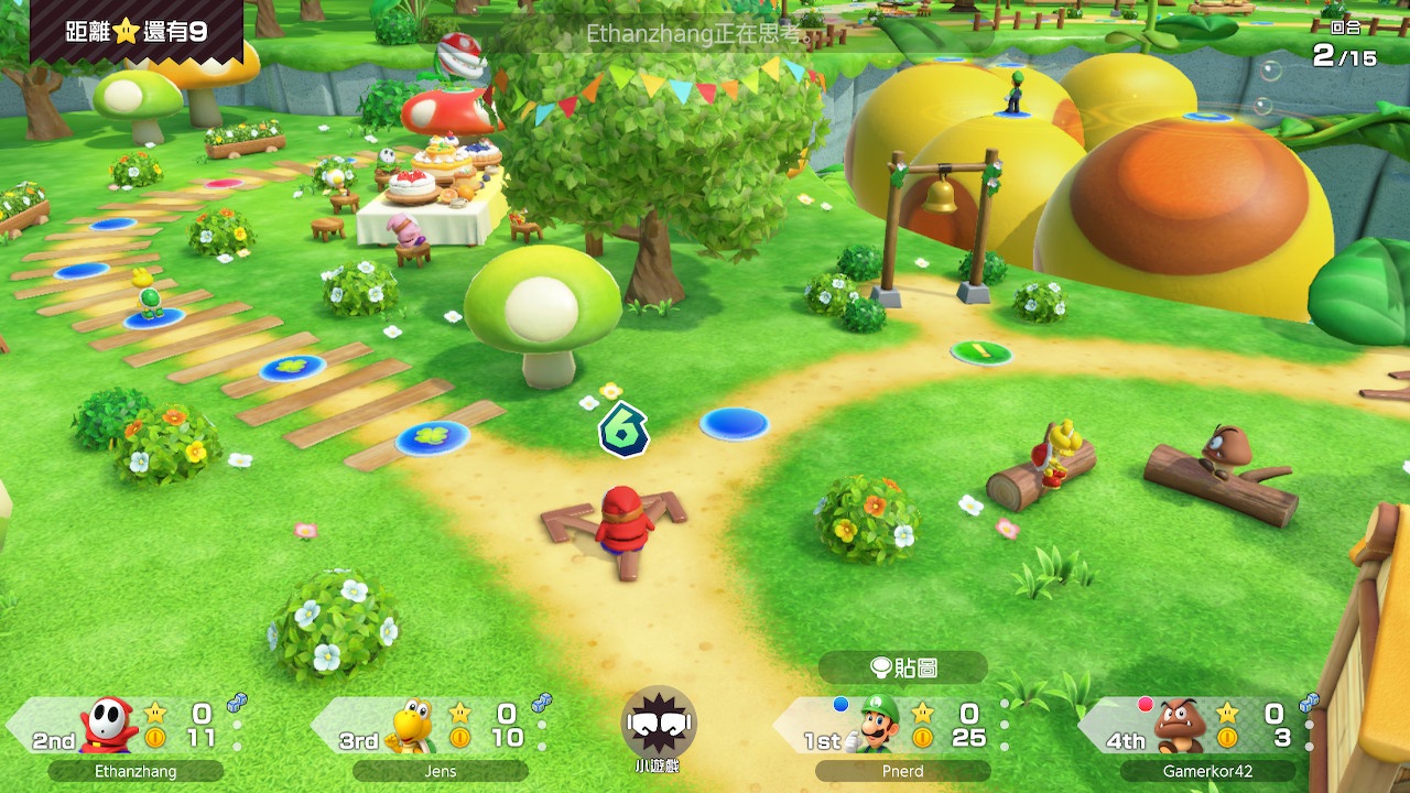 派對,瑪利歐版的雙路/大富翁桌遊類型,以富有機制變化的地圖和諸多小遊戲構成。大家丟骰子移動,時不時觸發地圖上的機關,影響自己或他人的機會與命運。每回合結束進入小遊戲,贏的人賺錢;在地圖上買星星,誰星星多就獲勝。這系列自 Wii 的八代之後,負責的團隊感覺忘記派對的精髓,地圖機制越做越爛,一直到 2024 的空前盛會,才有強勢回歸的感覺。