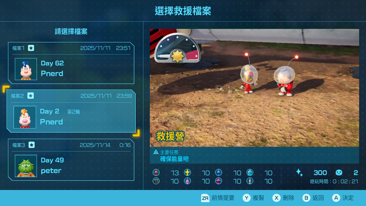 最後兩項更新,官方都沒提,但我覺得是神來一筆。第二輪可以繼承所有顏色的歐擬蛹,以及跳過前面整段冗長、囉嗦到不行的超保姆教學。進新檔的時候,會問要繼承哪一個紀錄,選完後,此繼承的新存檔會顯示第二輪,進遊戲後就是基地處,且所有顏色的皮克敏都給十隻。
