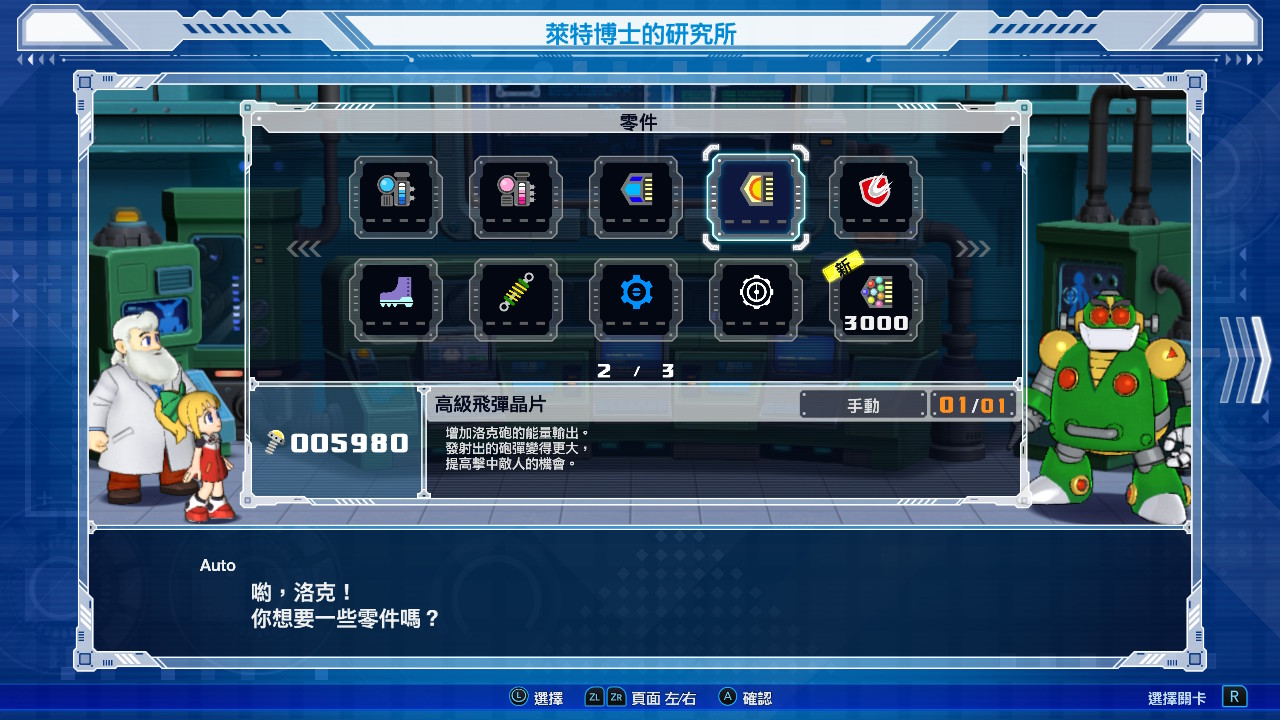 另外,也增加了購買機制。進關卡之前,可以花錢加命、買能量罐,也有各種輔助用的晶片,如自動集氣、砲彈變大、加快齒輪散熱。洛克人是難度很高的遊戲,在這些東西的輔助下,難度下降很多,讓休閒玩家如我,可輕鬆體驗,大加分。
