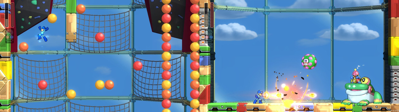 我最喜歡彈跳關卡,靠撞擊圓球組成的牆壁,彈跳向上,中途小Boss會打氣弄出一隻青蛙氣球,還有射擊之後彈來彈去的頭目,整關打起來特別逗趣。