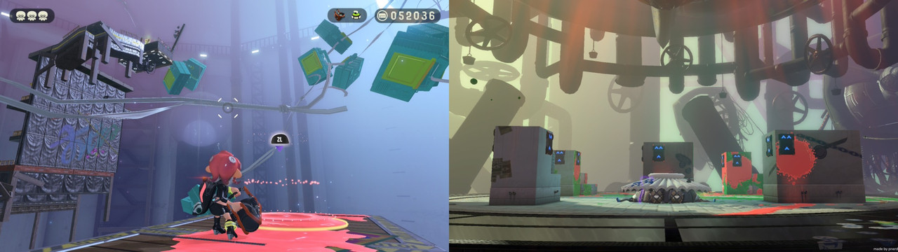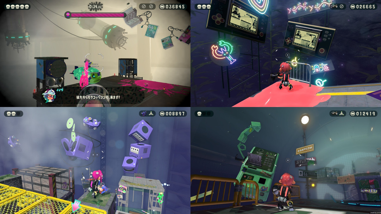每個車站都是一個獨立的異世界關卡,天空中散落著復古味十足的物品,歷代的老任主機、真空管、黑膠底片、映像管螢幕、戰車鉛筆盒、魷型公用電話等等。Game&Watch 的螢幕還改成噴漆魷魚的畫面。